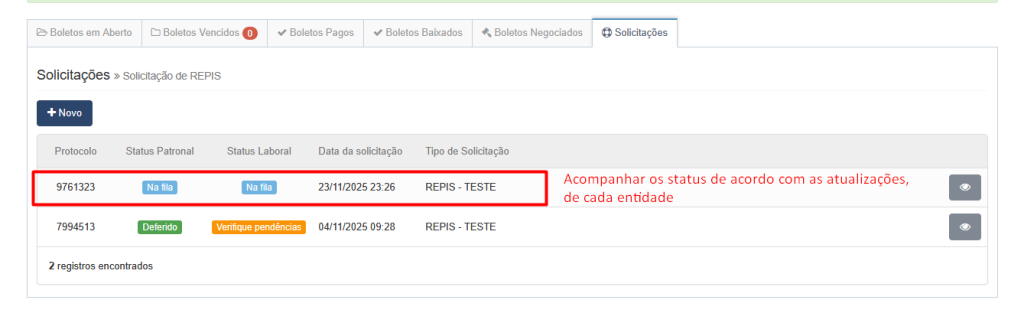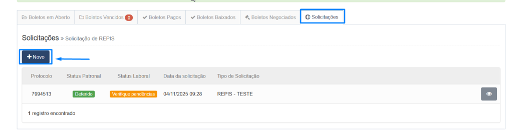 5º Passo - Solicitação do Repis, clicar na aba repis > clicar no botão Novo